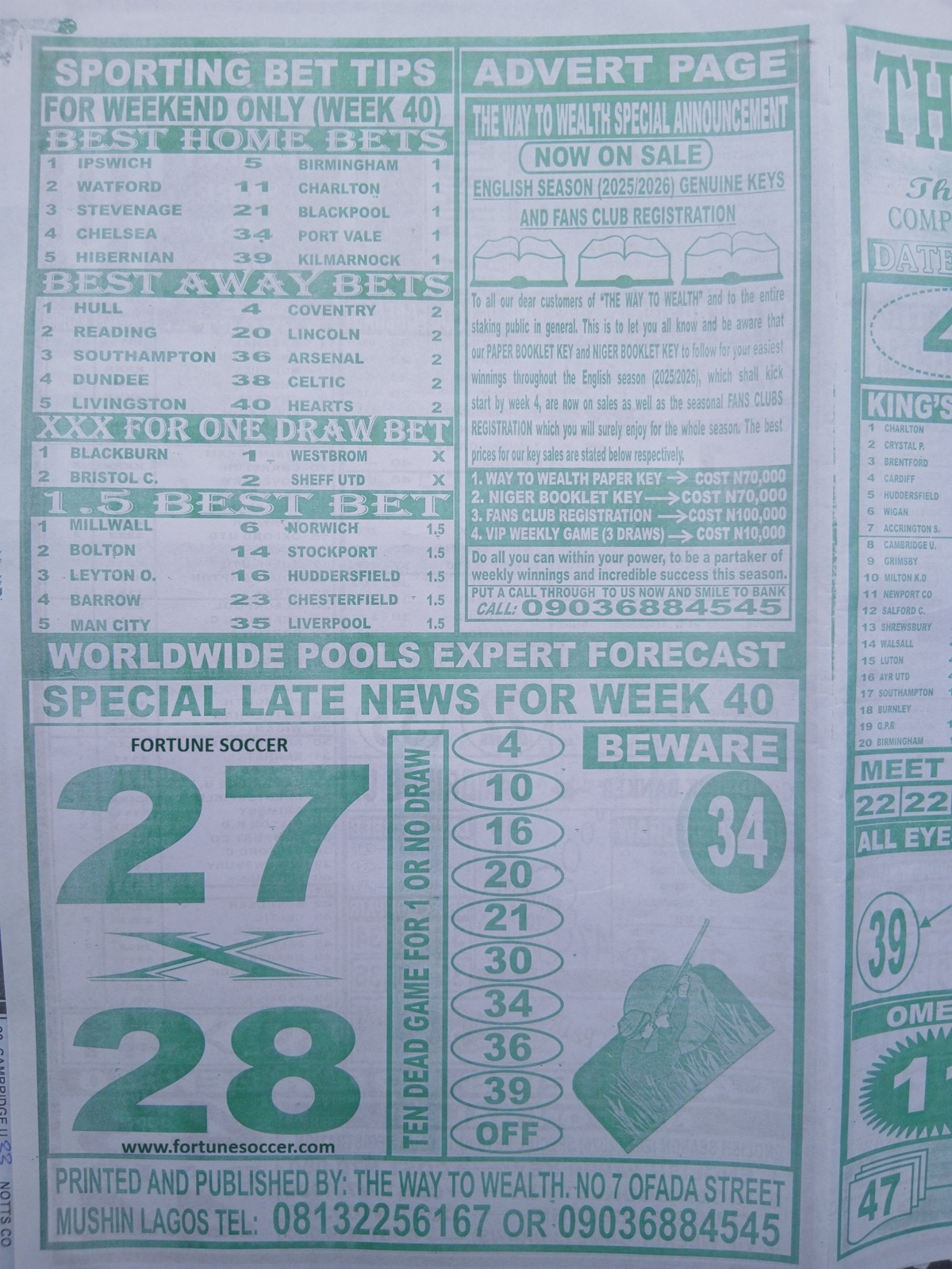 Bob Morton, Capital International, Soccer “X” Research, Special Advance Fixtures - Pools Late News Papers