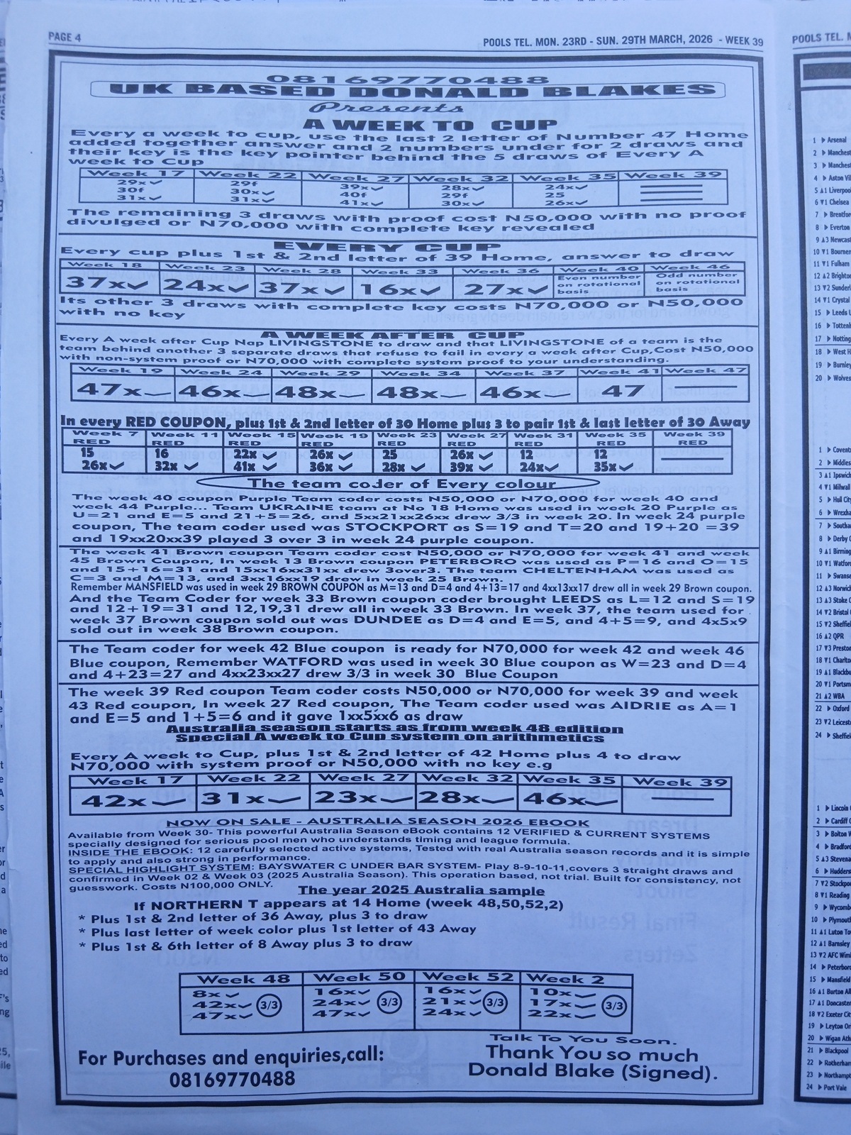 Advance Fixtures is the official RSK preview guide and features the full list of 49 matches, game numbers, match pairings, and key match indicators. See Week 39 pool rsk papers for the special advance fixtures below: