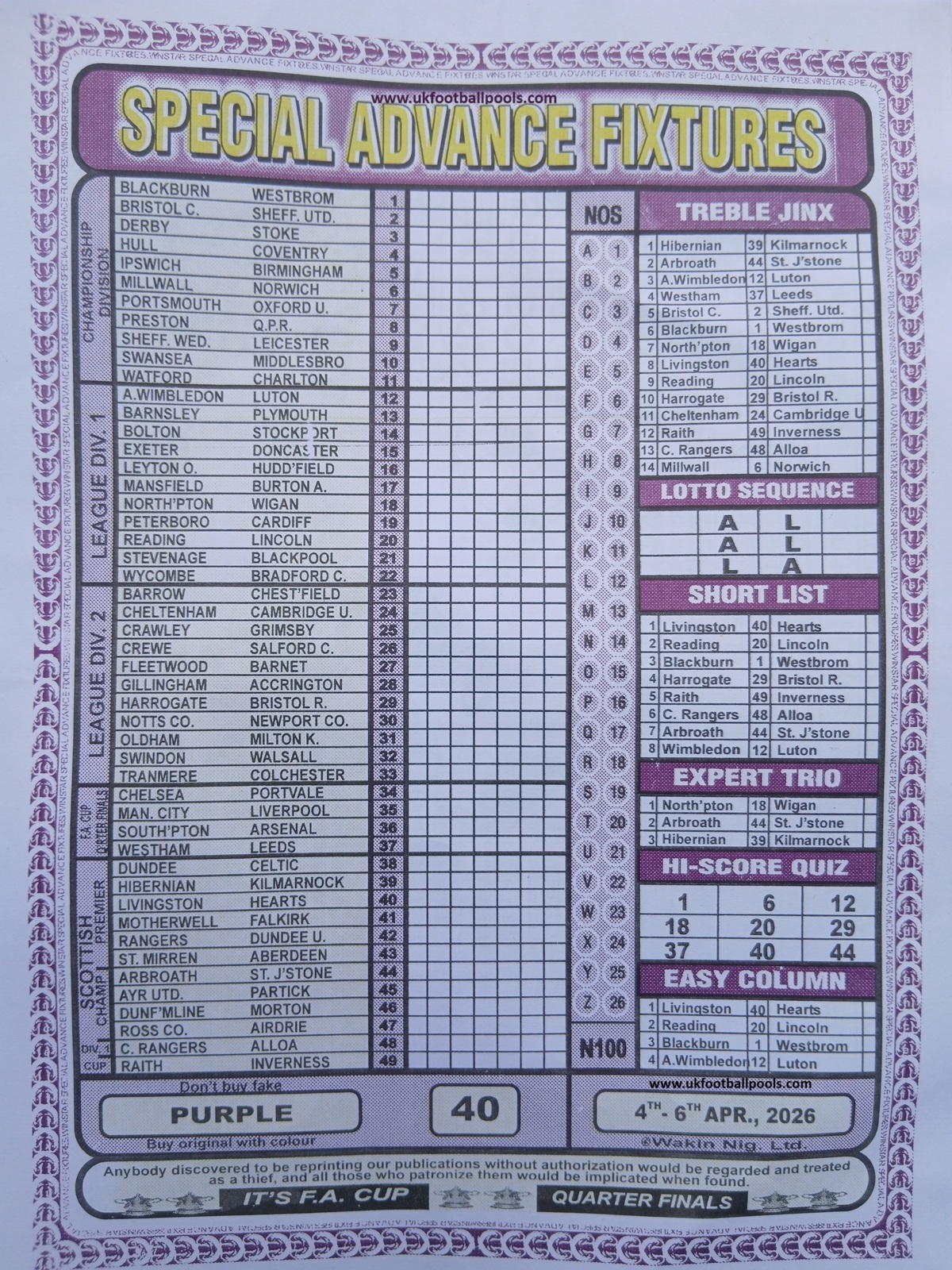 Week 40 Pool RSK Papers 2025/2026: Beyond the well-known RSK papers, we also bring you a variety of other top-tier resources. You can explore papers such as WinStar, BigWin, and Pools Telegraph, which provide additional insights into the weekend’s football action. Additionally, we offer a selection of crucial Pool fixtures and Pool results, including Dream International Fixtures, Special Advance Fixtures, and Right On Football Fixtures.