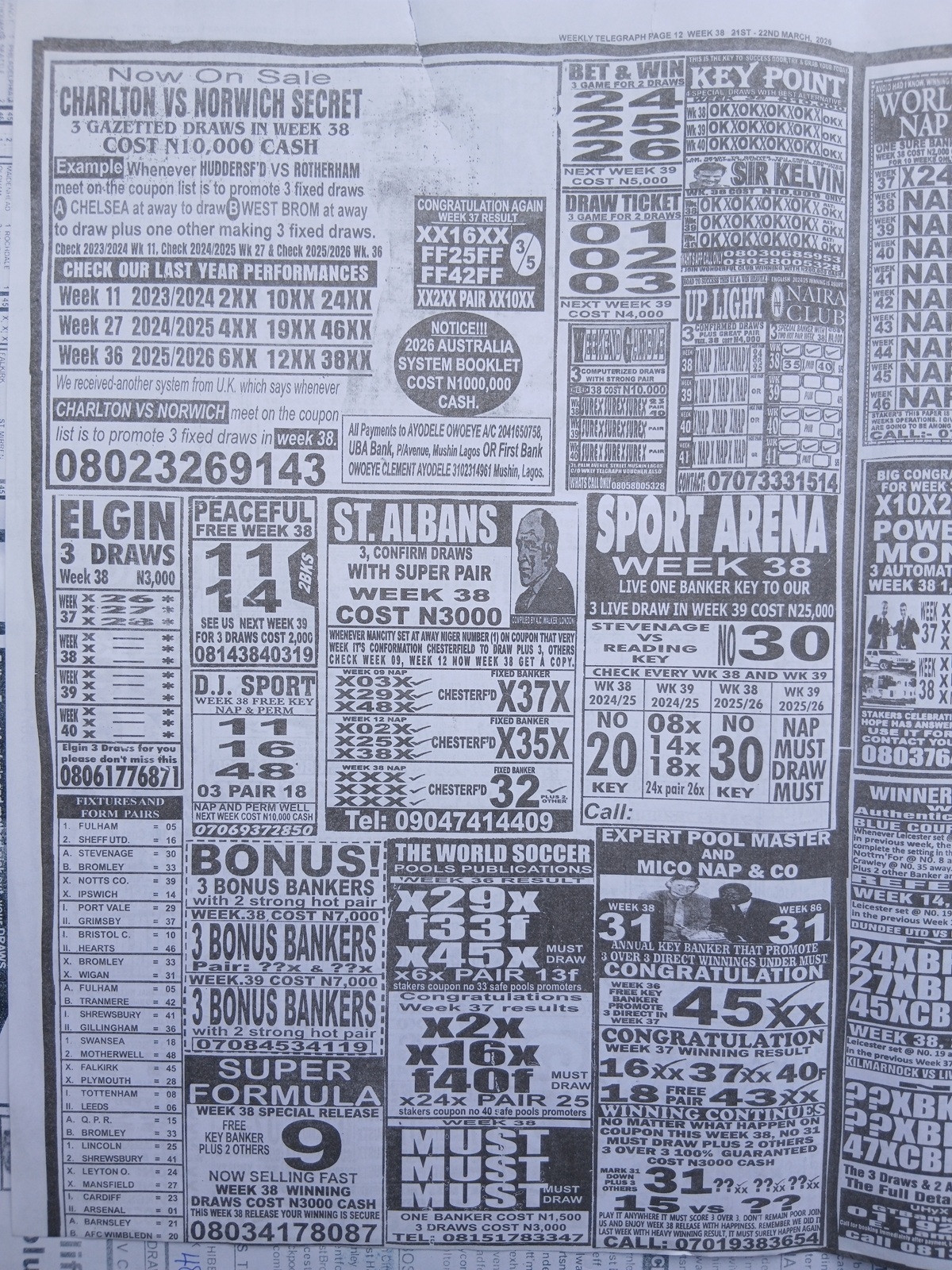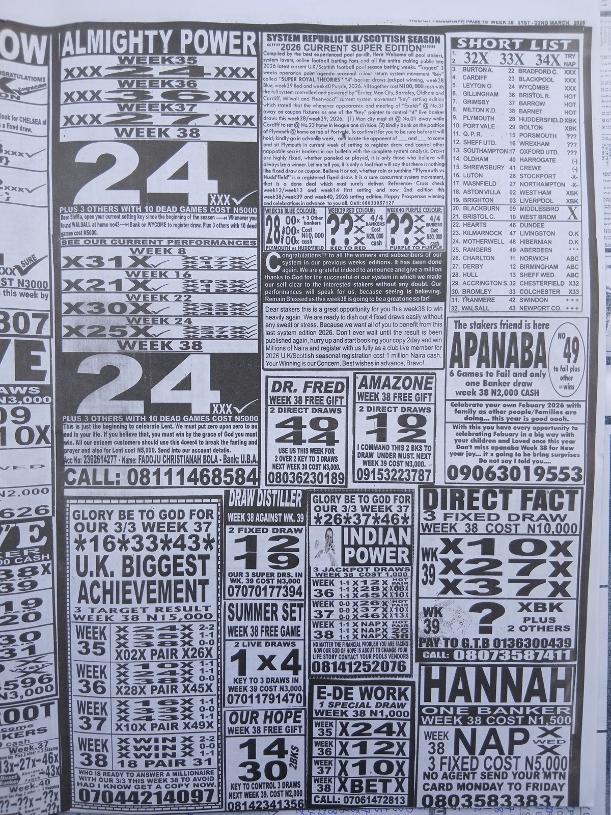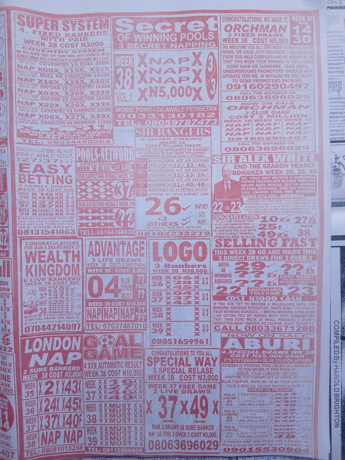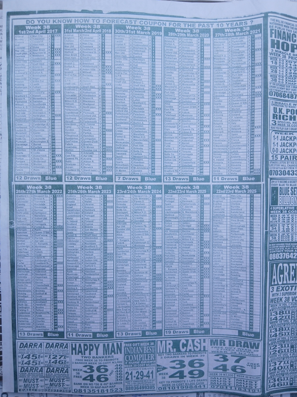 This is the total money you are betting with.Whether you’re chasing banker games, strong draws, or safe permutations, these Week 38 weekly Telegraph papers are designed to guide your strategy and maximize your potential returns. Stay informed, play smart, and take a confident step closer to winning this weekend.
