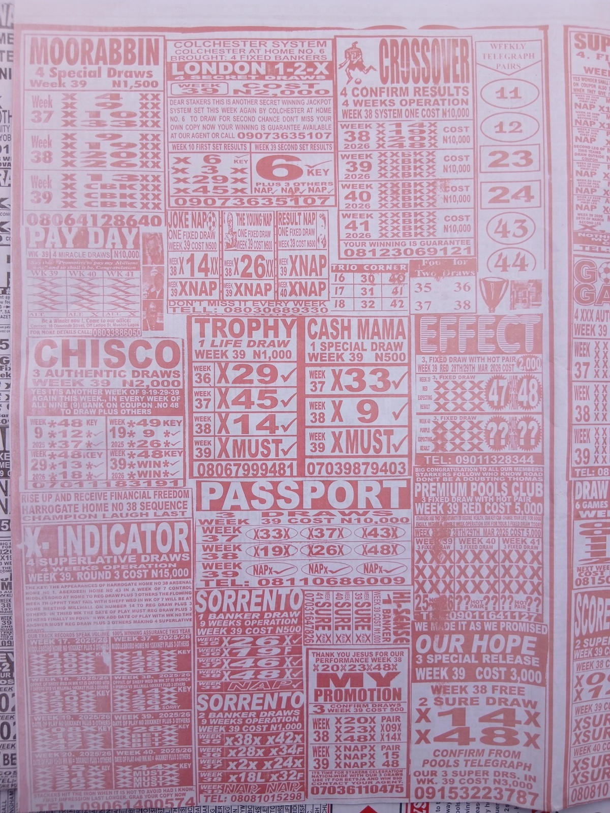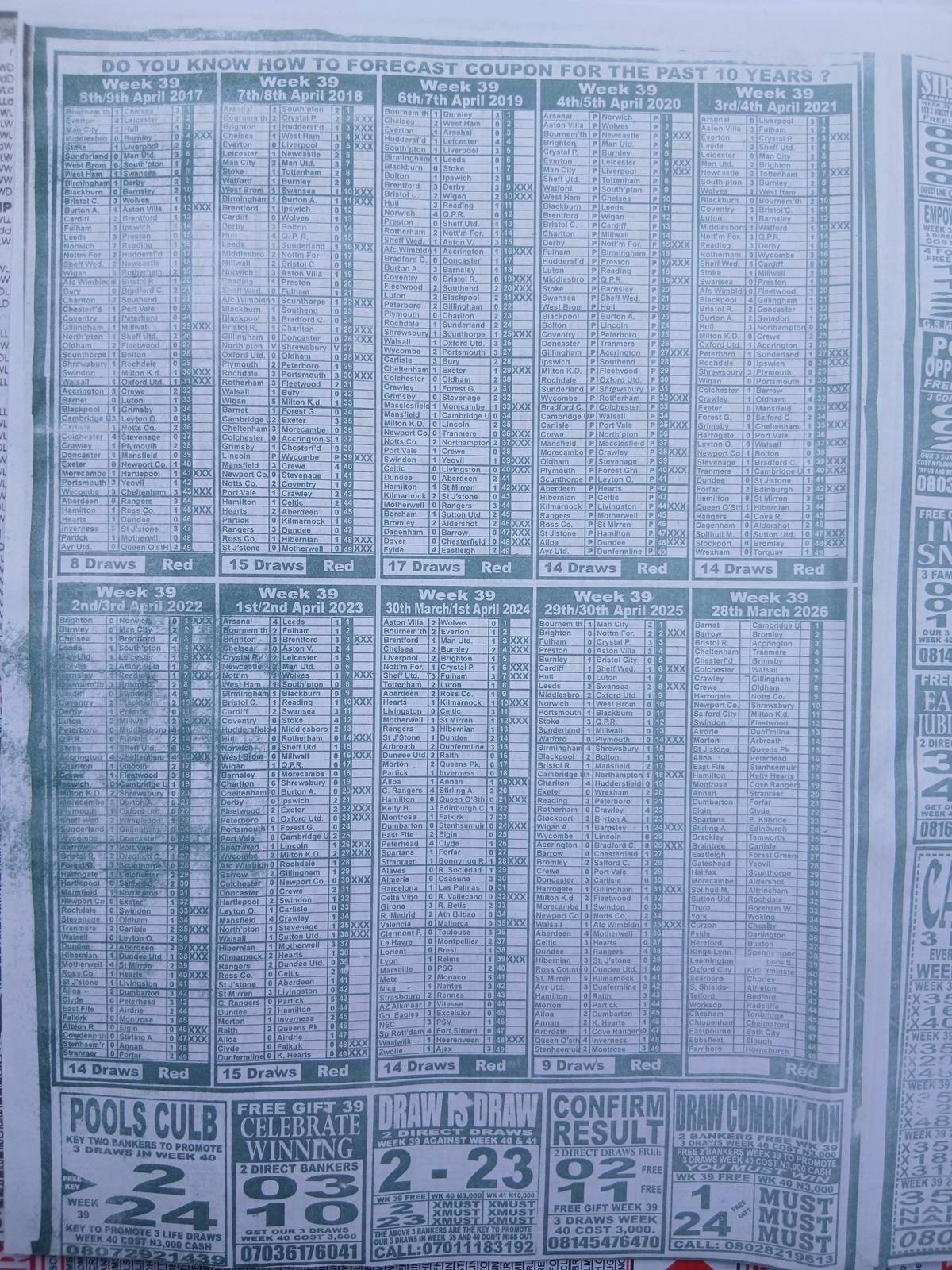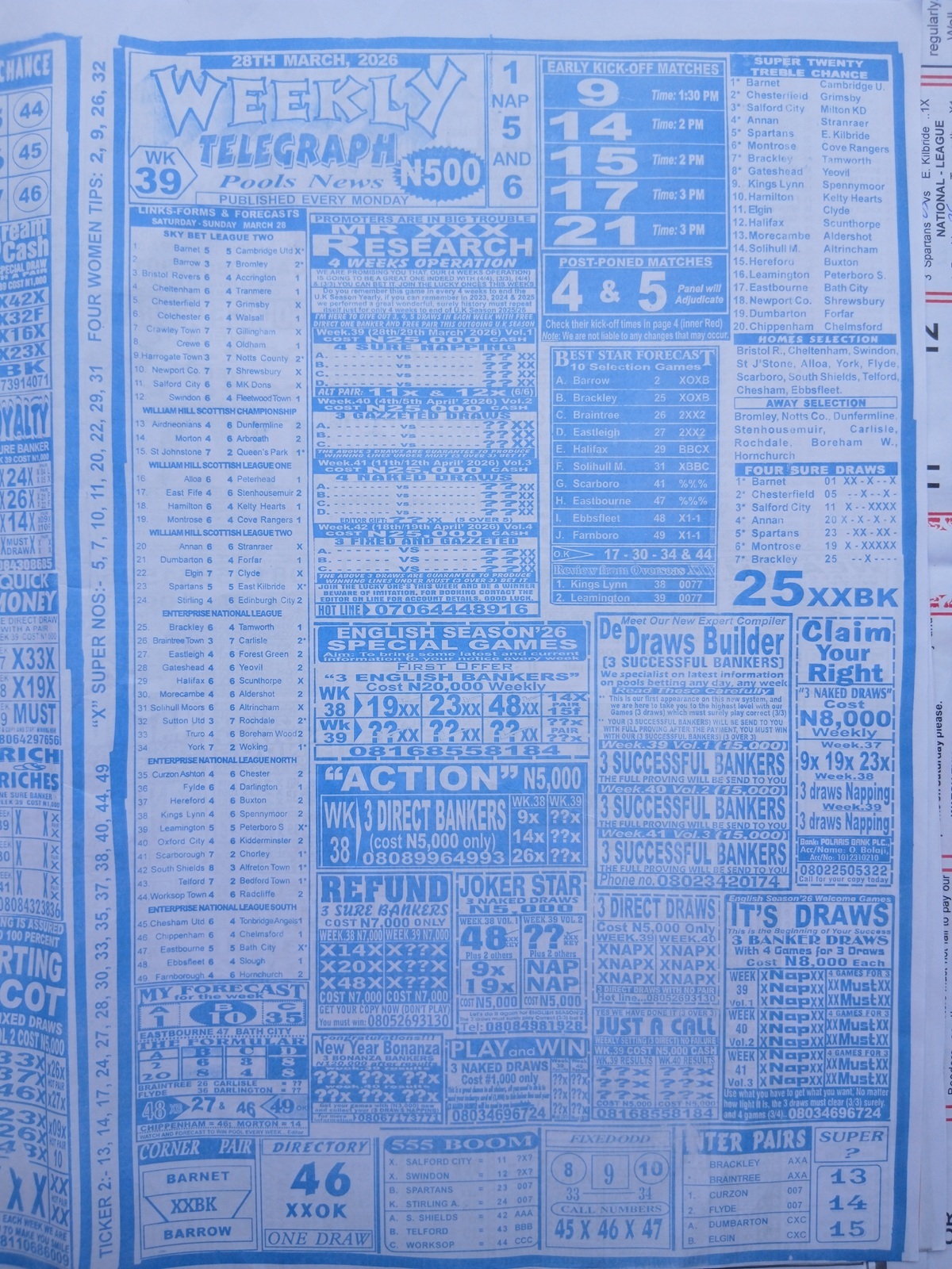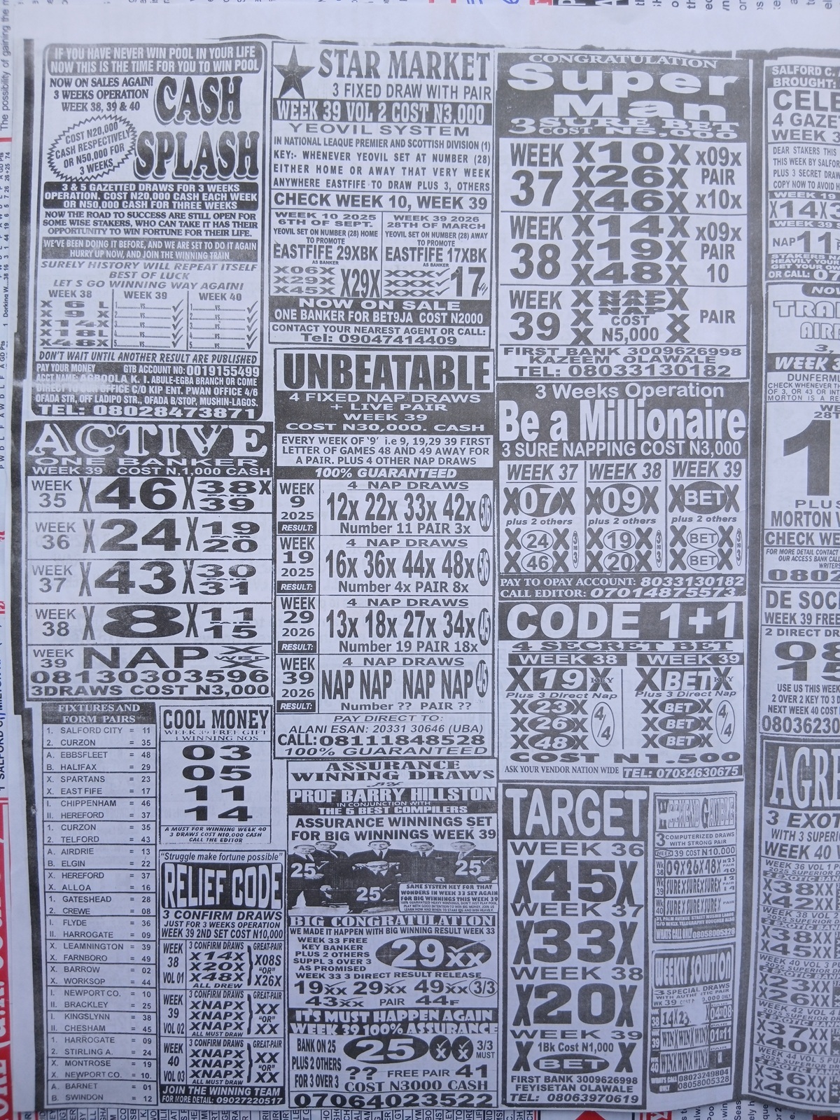 This is the total money you are betting with.Whether you’re chasing banker games, strong draws, or safe permutations, these Week 39 weekly Telegraph papers are designed to guide your strategy and maximize your potential returns. Stay informed, play smart, and take a confident step closer to winning this weekend.